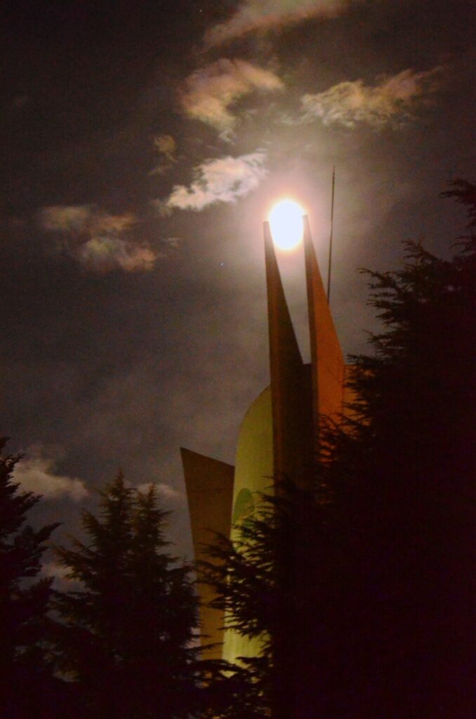 コメント:高山さんの投稿を見て、月が貯水塔に被る所を狙いに行きました。いざ構えてみると月の移動が意外に早くてまごついているうちに構図が予定と変わってしまいあわてました。月も貯水塔の先端ももっと輪郭がはっきり撮れる方法を教えて下さい。