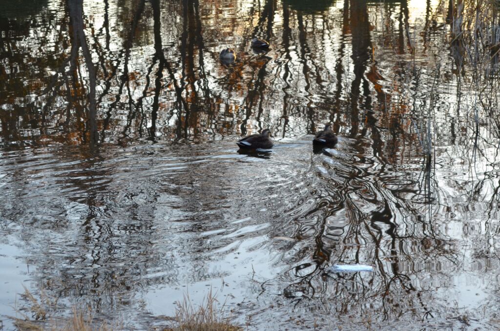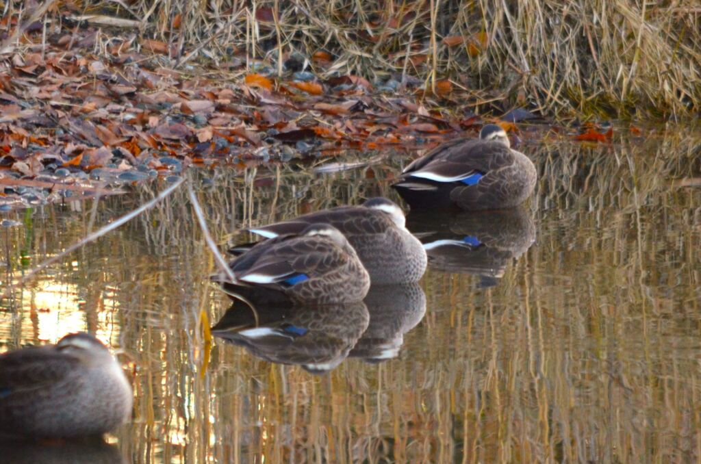 コメント:午後の弱い日差しの中で鴨が羽に頭をうずめて休んでいました。来る寒さに体力温存か?最初はどういう格好をしているのか分からず、不思議に見えました。
