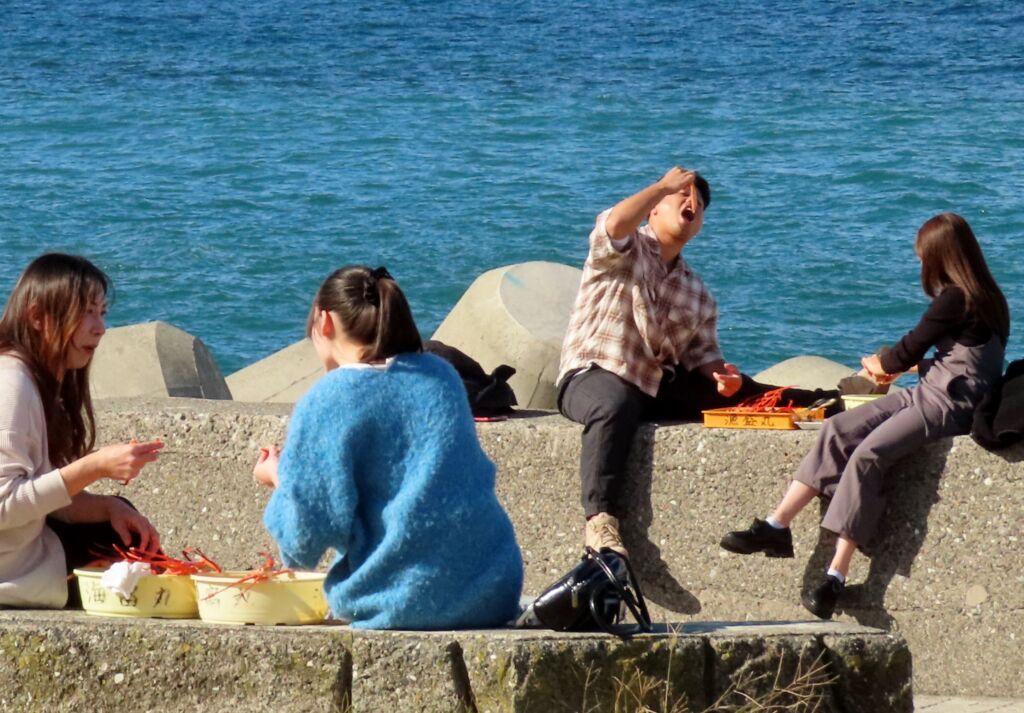 火の熱さが届かない回りでは早速、焼きあがったお餅やサツマイモを口する家族も。今年1年の無病息災、家内安全の願いを込めていました。