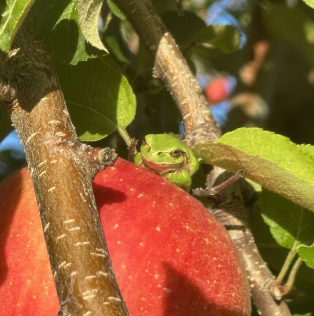 コメント:リンゴ農園にバイトに行きりんごの葉摘みをしている時、りんごの上に乗っているカエルが目に入りました、こちらを見るのを待ってスマホで撮りました。