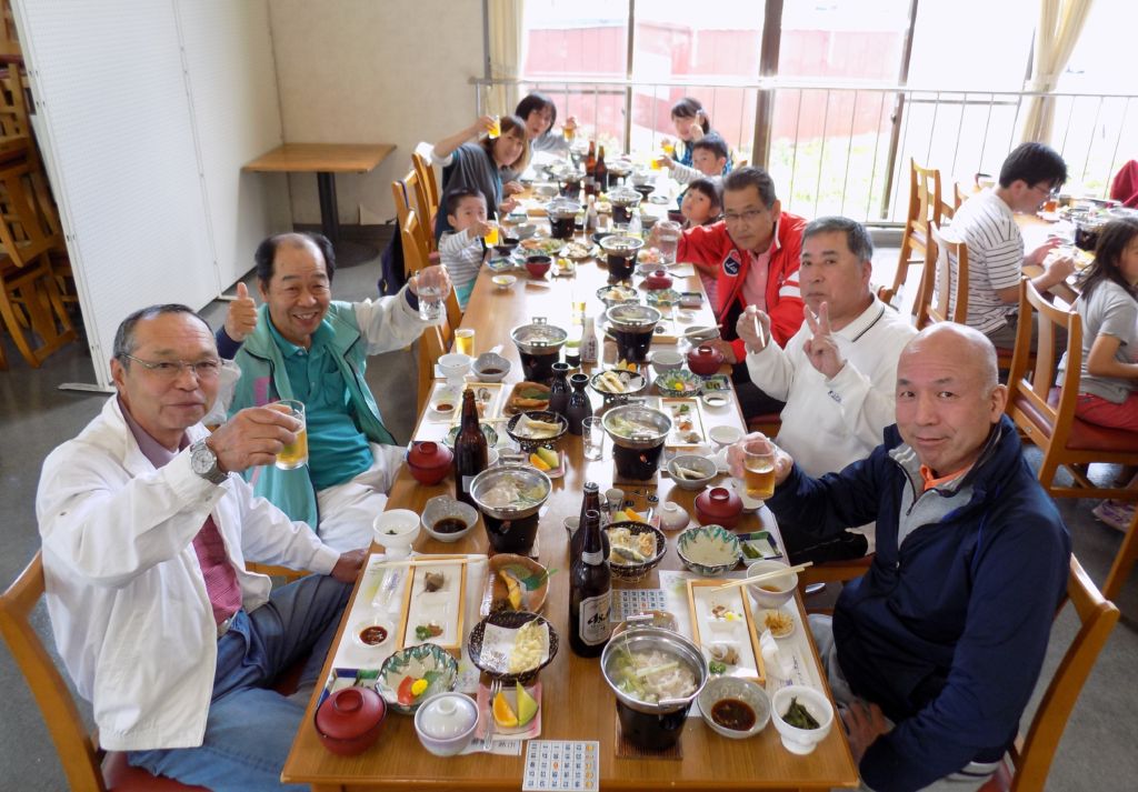 昼食は飲み放題で、食事も食べきれないほど。あちらこちらで赤い顔をしたおじさんたちが、だべったり笑い合ったり…。和やかな光景が繰り広げられました。ビンゴゲームでは、番号が書き出されるたびに、「惜しい」「ビンゴ、完成」などの叫び声が飛び交い、盛り上がっていました。