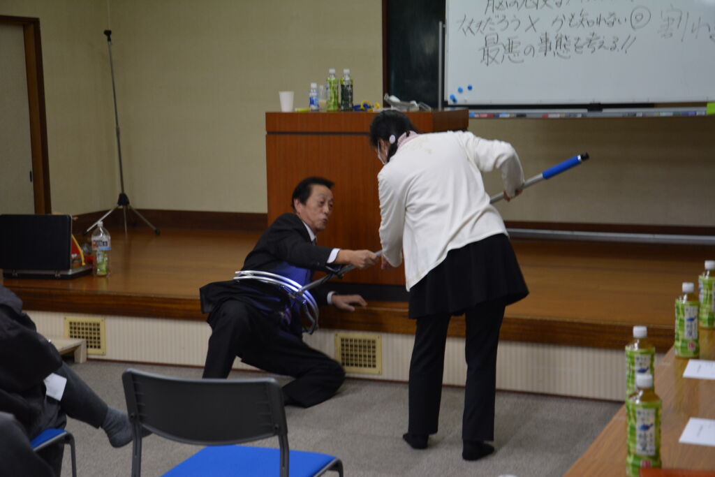「先生できました」と3常会の長谷川由美子さん(左)と4常会の松岡利美さん。「上手くできたね」と講師の飯島源一さんにほめられて笑顔があふれました