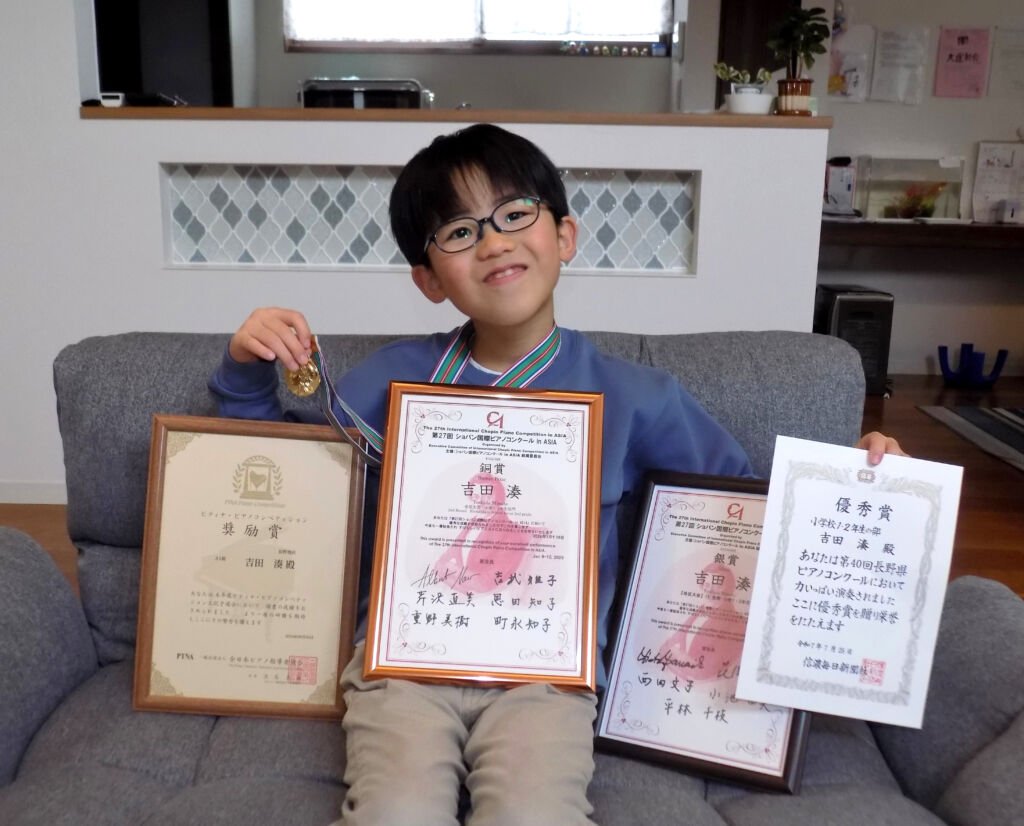 昨年11月に「第27回ショパン国際ピアノコンクールinASIA」の長野地区大会で銀賞を獲得、今年1月に川崎市で開かれ200人近くが参加した全国大会に出て銅賞を獲得しました。さらにそのあとに開かれたアジア大会にも出ることができました。このほか、昨年7月の「第40回長野県ピアノコンクール」でも優秀賞を得て金メダルをもらっています。「いっぱい練習しました。練習するほど報われるんす」とはきはき話します。