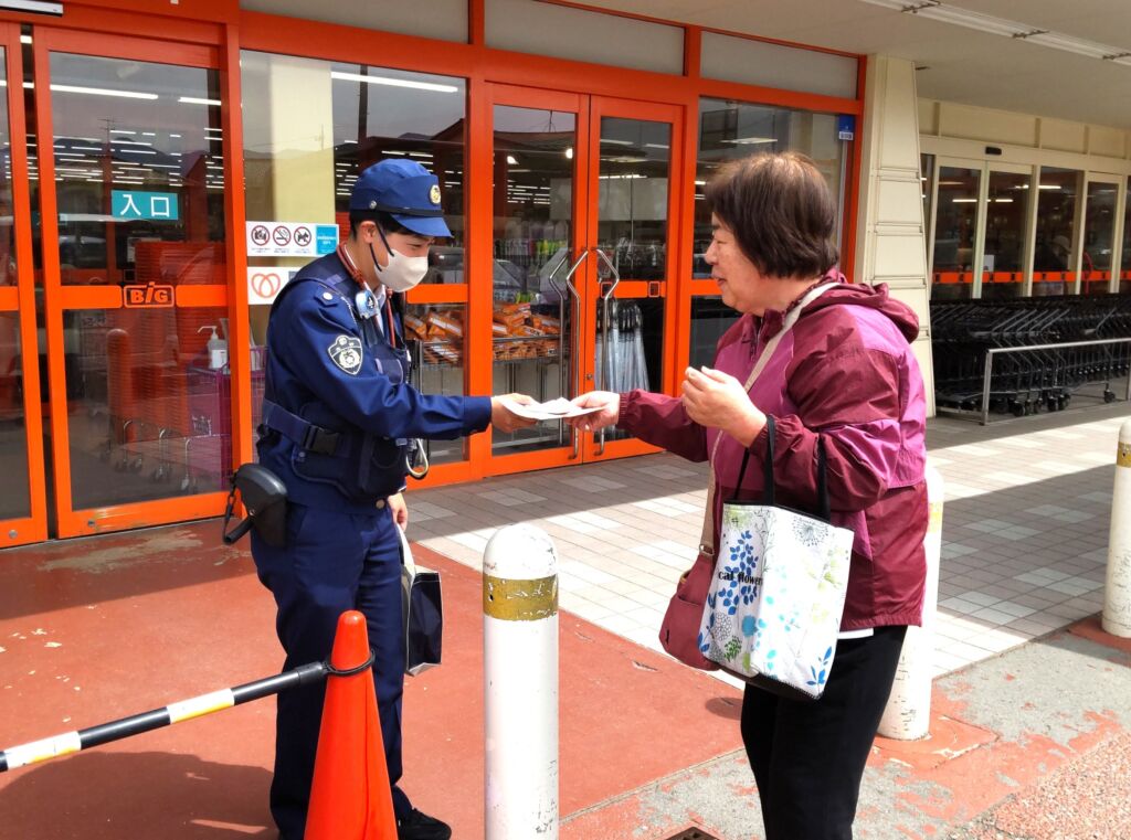 買い物客は「分かりました」「ありがとう」などと言いながら受けとです。取っていました。春の交通安全運動の期間中は市内の各スーパーマーケットで啓発活動を行っているとのこと。