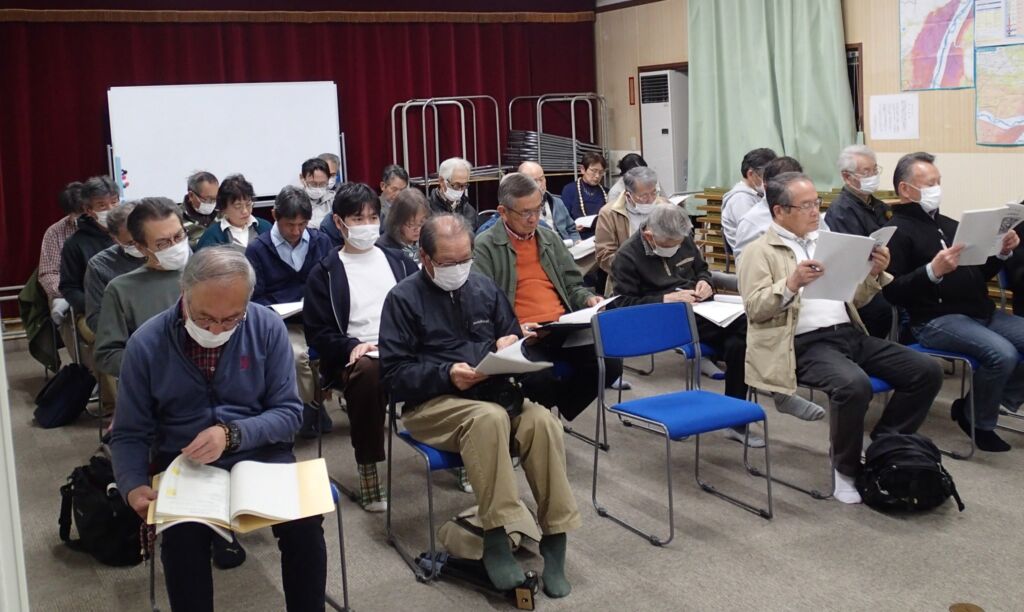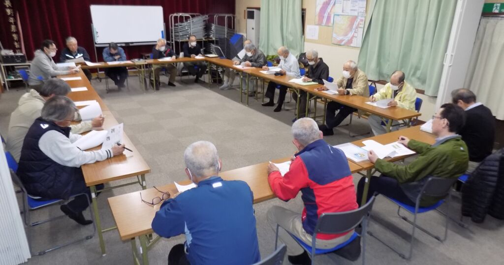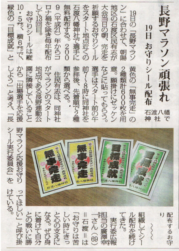 今月19日に行われる長野マラソンのスタート前に石渡八幡神社に参拝する選手たちに、無料で配る応援お守りシールができました。15日夜に石渡公民館に約20人が参加して実行委員会を開き、当日配布する役割分担や準備品などについて話し合いました。