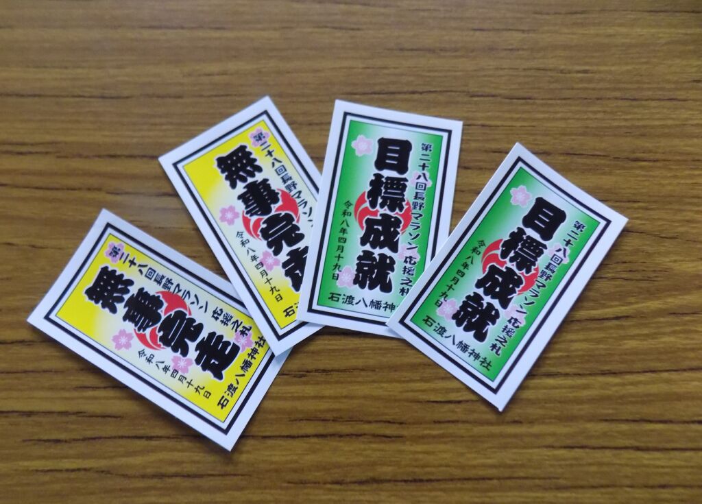 シールをつくったのは3常会の広沢幸一さん。シールは「無事完走」と「目標成就」の2種類。合わせて600枚つくり、選手たちには参拝後、どちらか1枚を選んでもらいます。選手たちは、シールをウエアの胸やバッグ、ゼッケンなどに貼り付け、シールに力づけられてレースに臨みます。