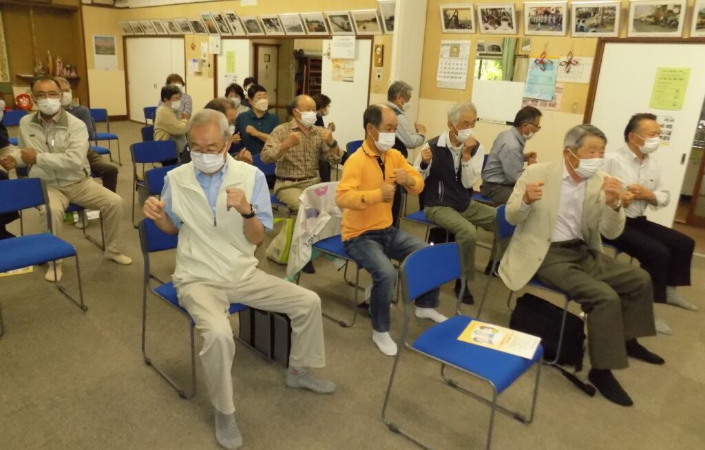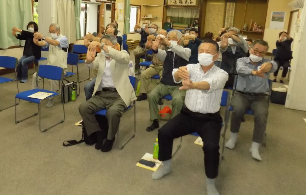 講演の後は健康体操です。体を丈夫にするだけでなく、痴ほうにも効果があるとのことで、全員が一生懸命に取り組みました。しかし、両手両足が異なる動きや速さになるためかなり難しく、笑いや悲鳴が起きていました。