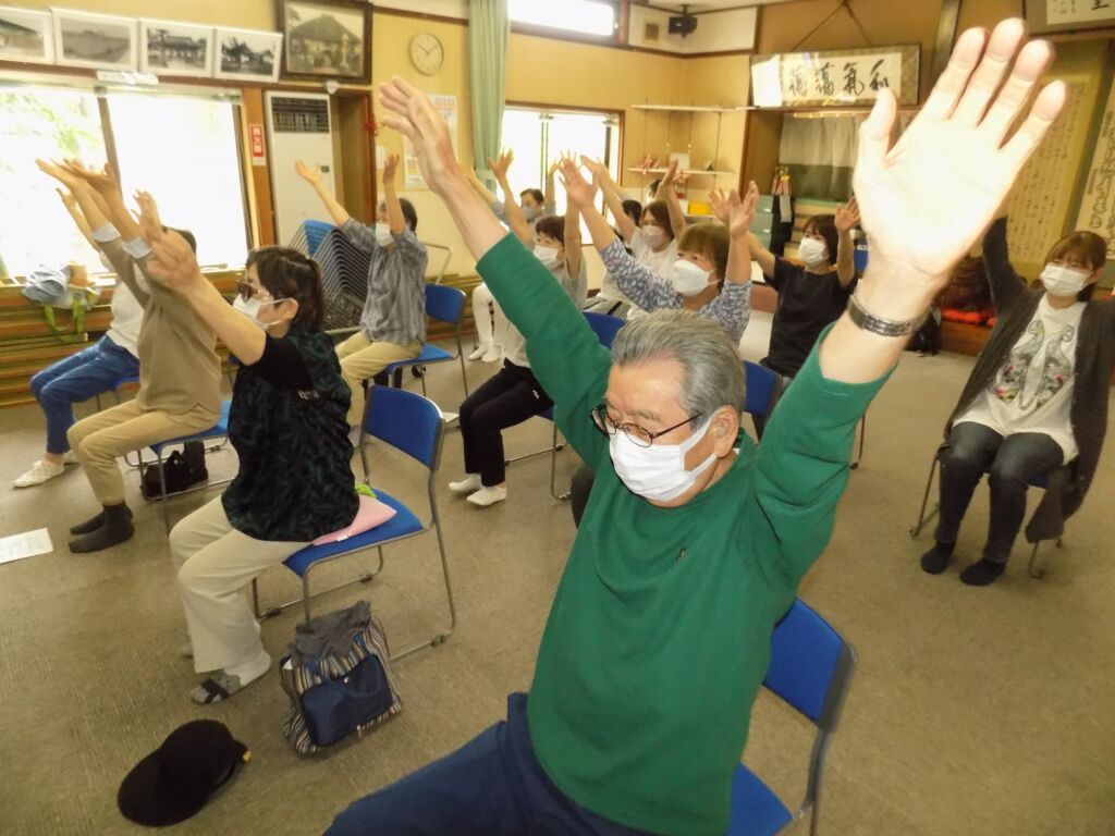はつらつクラブは、新型コロナ感染が下火になったのを受け、再開されたもので、それでも全員がマスクを着用しながら行いました。今後は毎週月曜日に開く予定で、体操を終わった後にお茶会を開いて互いに会話を楽しむことにしています。