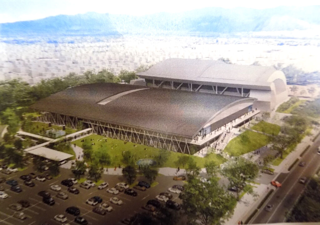 説明によると、新体育館は現在の総合体育館とアクアウイングの間に建てられます。3階建てで高さは18メートル余。今月末に着工して3年後の令和9年12月に完成予定です。1階はメインアリーナとサブアリーナ、柔道場や剣道場が入り、2階は体操練習場が、3階は放送室の構成になっています。1、2階合わせて約2000の観客席が用意されるとのことです。