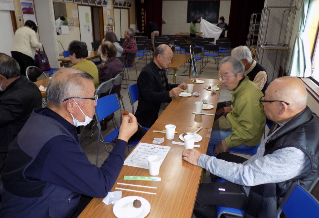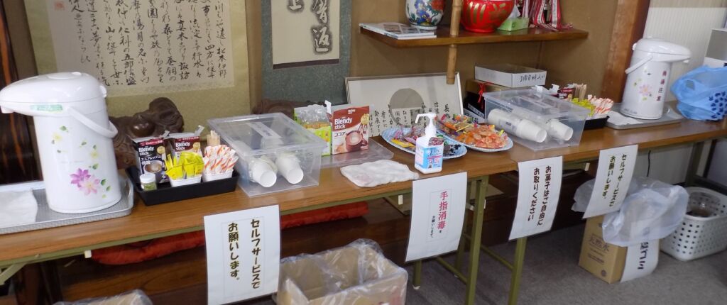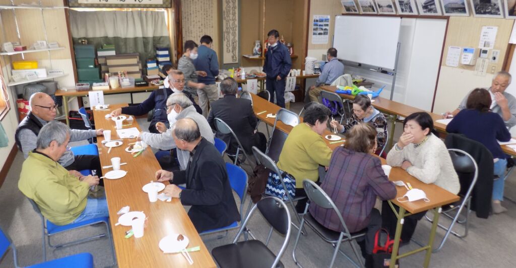 会場の一角にはたくさんのお菓子や飲み物が並べられ、竹内一郎さん(2常会)によるベトナムコーヒーの提供や、横田八重子さん(1常会)の手作りによるデザートのサービスがあり、参加者はそれらを味わいながら会話を楽しみました。
