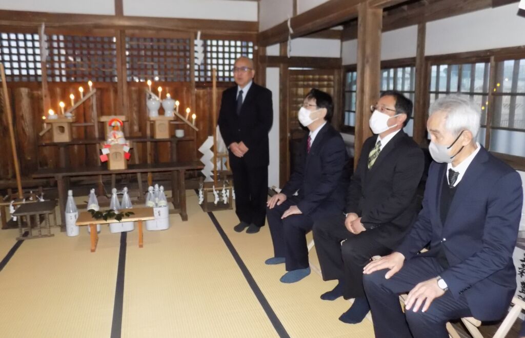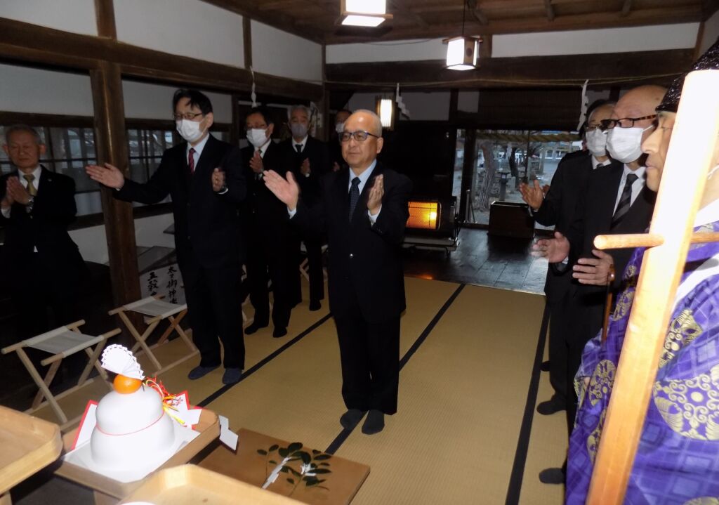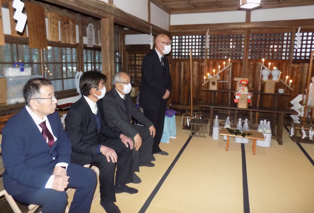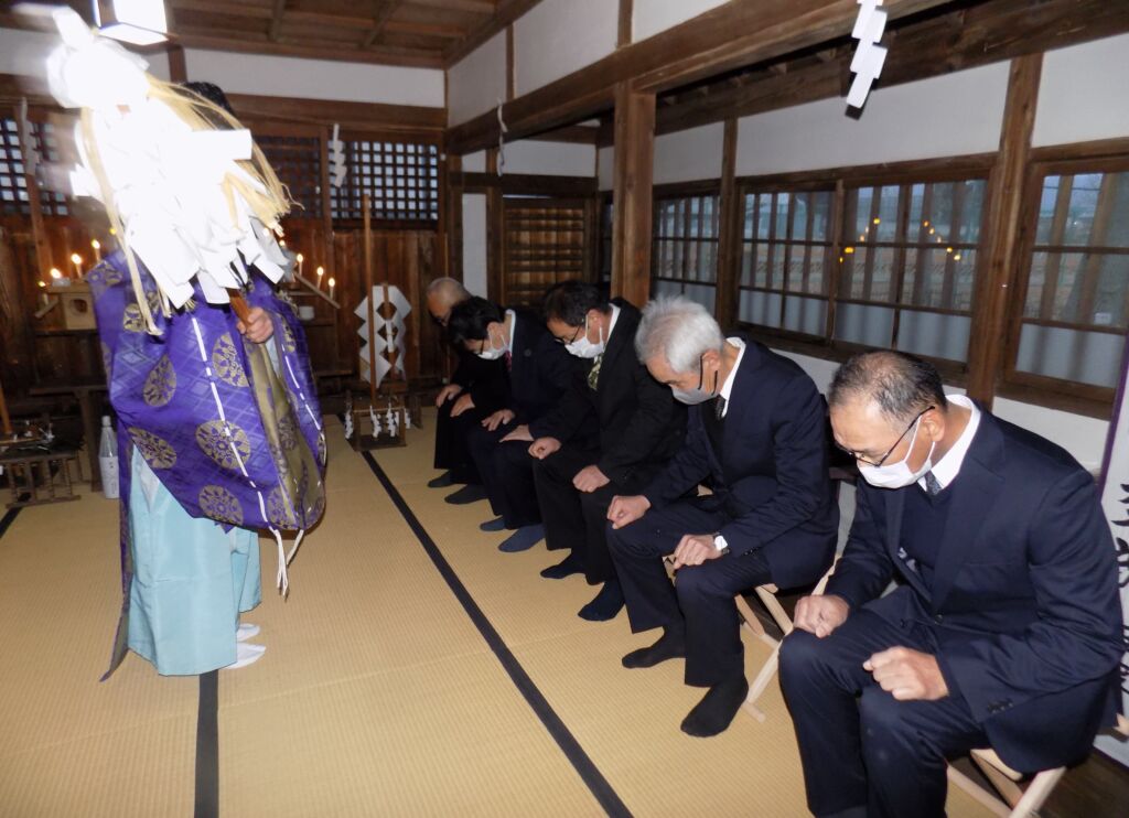 ■ 石渡区, 石渡フォトニュース 令和7年から8年にかけて石渡八幡神社で越年祭と元旦祭が行われました 2026年1月2日 記者 【元旦祭】 元旦の午前7時、雪もなく薄曇りで穏やかな天候に恵まれ、同じ石渡神社拝殿で、元旦祭が行われました。氏子総代の徳武美喜男さんや区長の佐々木利明さんをはじめ、11人が参加しました。倉澤宮司が石渡区や区民の安全や健康を祈願しました。 区の役員らが見守る中、倉澤宮司が区の安全や区民の健康を祈願しました 祈願の後、氏子役員のみなさんらがお祓いを受けました 続いて区の役員もお祓いを受けました。神妙な表情です 氏子総代の徳武美喜男さん(中央)をはさんで、全員で柏手を打って祈願しました 最後に氏子総代の徳武さんが「平和な1年でありますよう」とあいさつ 佐々木利明区長も「良い年になりますよう祈念します」と話しました 倉澤宮司を真ん中にして、氏子役員や区役員らが記念撮影。なかなか迫力のある顔触れです 【記事と写真:石渡つうしん記者 水越渉】 ページ: 1 2