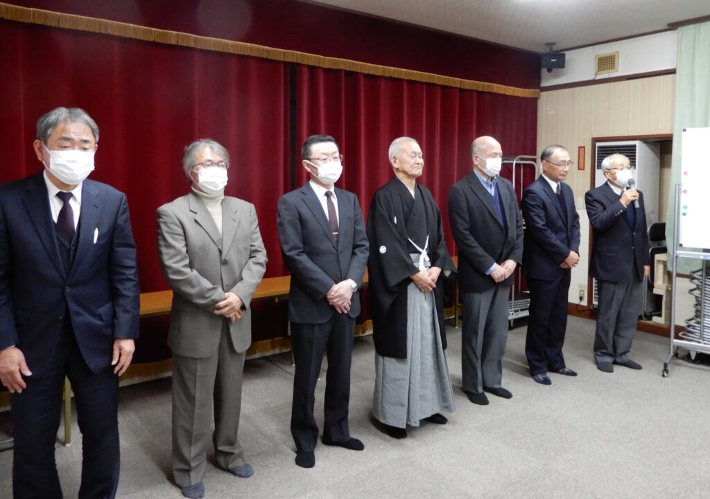 新しい役員が前に整列し、新区長の大津さんは「昭和29年生まれの午年です。農耕馬みたいに愚直に、一生懸命やりたいと思いますのでよろしくお願いします」と挨拶、続いてそれぞれ自己紹介を兼ねて挨拶しました。