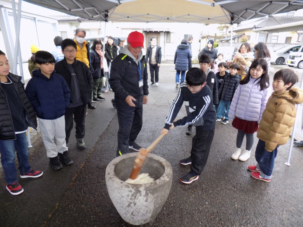 午前10時から公民館前庭で開かれ、大勢の親子が集まりました。公民館役員が用意したもち米15㎏を石臼に移し、「ヨイショ」の声援を受けながら、お父さんや子どもが順番につき上げ、貴重な体験をしました。つき上がったお餅は、あんこやきなこなどで包み、全員に配られあらためてお正月気分を味わっていました。