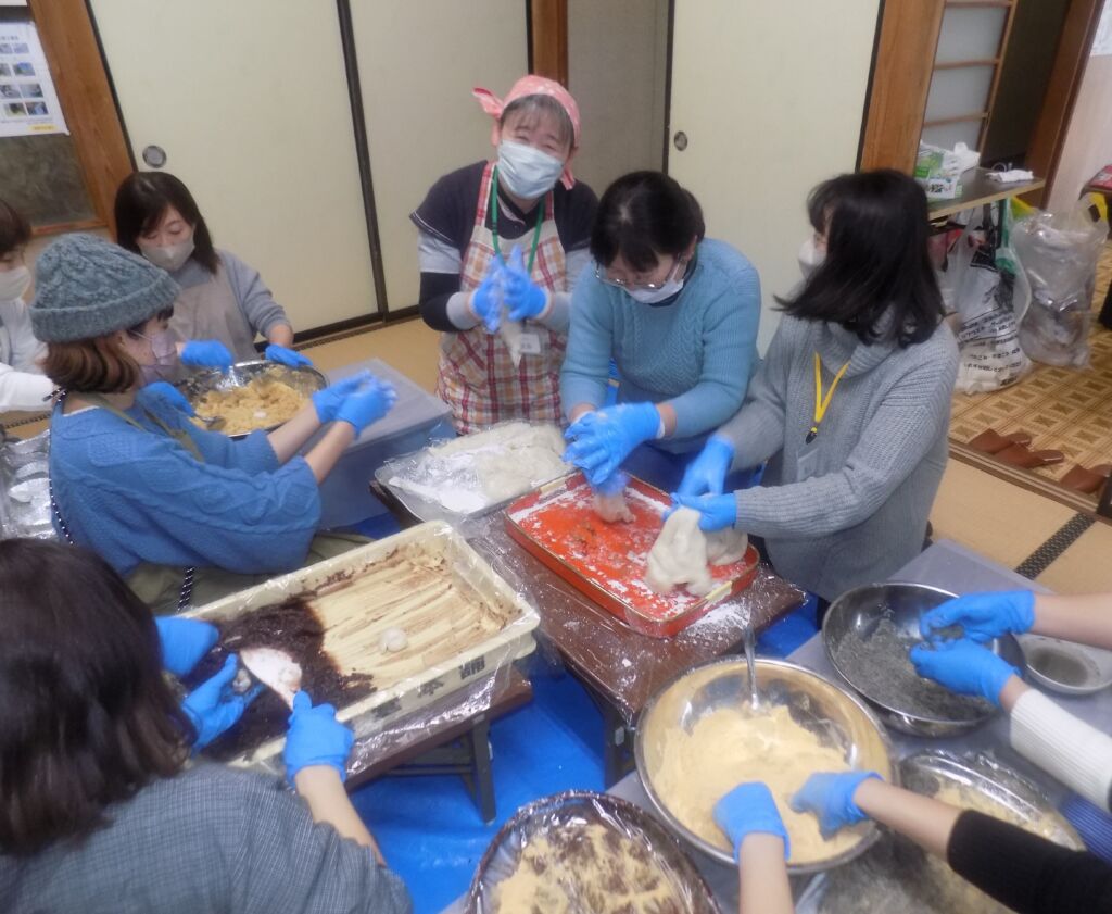 つき上がったお餅は女性役員のみなさんがあんこやきなこで包み、参加者に提供しました