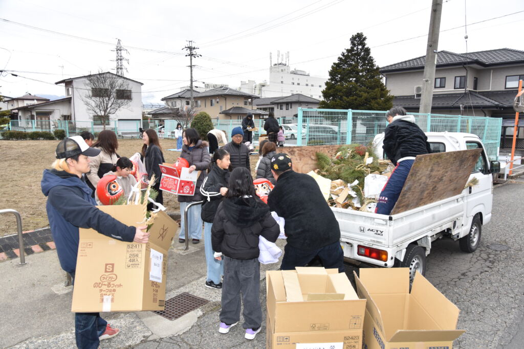 氏子総代、育成会、公民館の主催で、午前9時から育成会の子どもたちが各戸を回り「しめ縄集め」。回収したしめ飾り、だるまなどは一旦、公民館と5常会、9常会公園の3カ所に集め、軽トラで会場まで運ばれました。