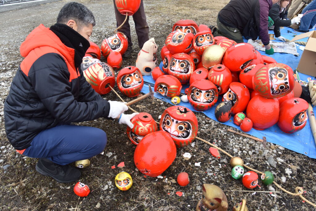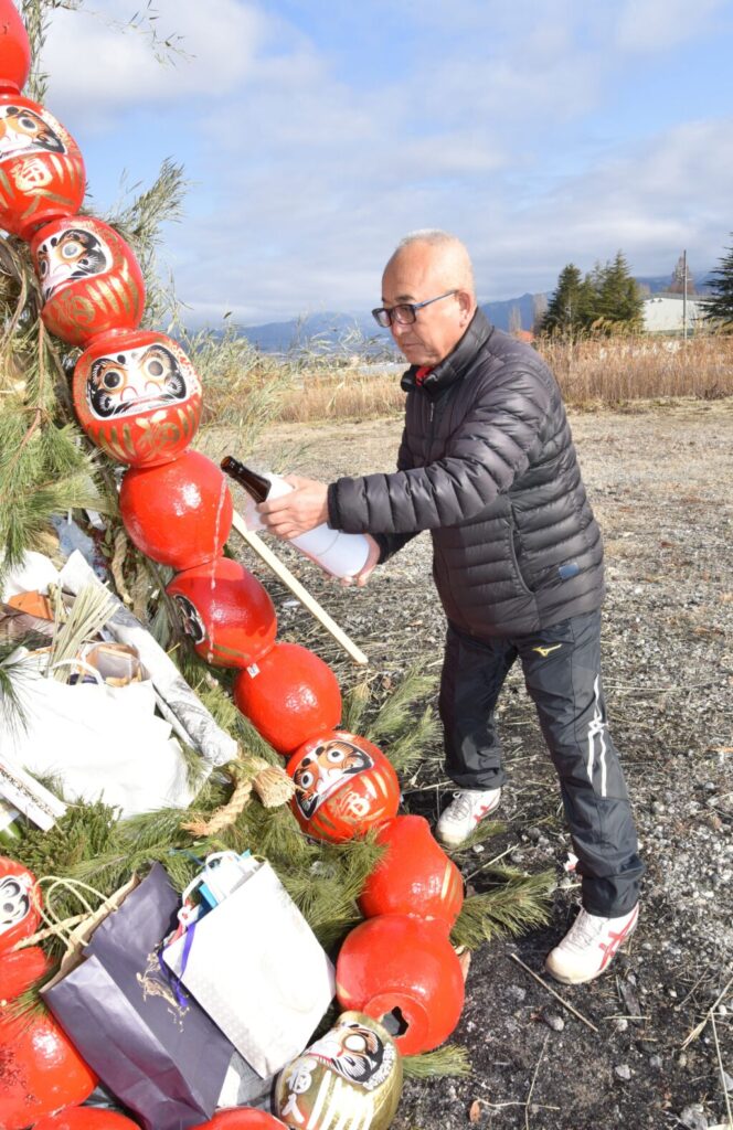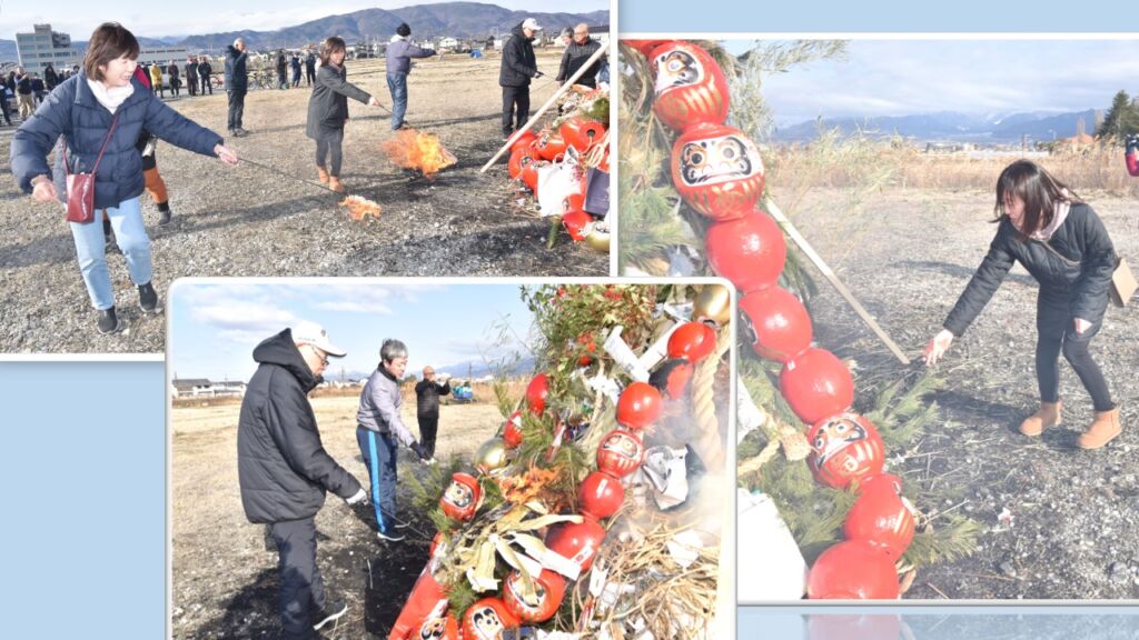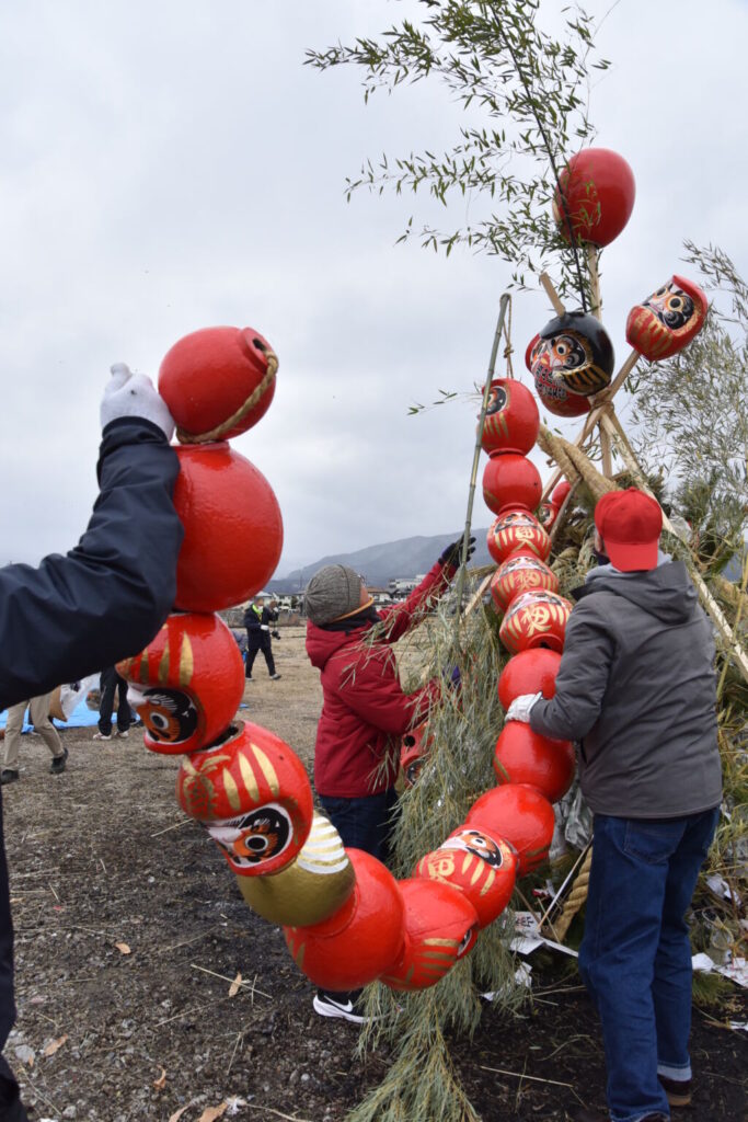 北からの寒風が吹きつける中、各主催役員らは、正月飾りの燃えない金具や燃やしてはいけないビニール、ナイロンなどを分離、だるまは頭と底に金づちで穴をあけ連結、やぐら作り前の準備作業に黙々と取り組みました。