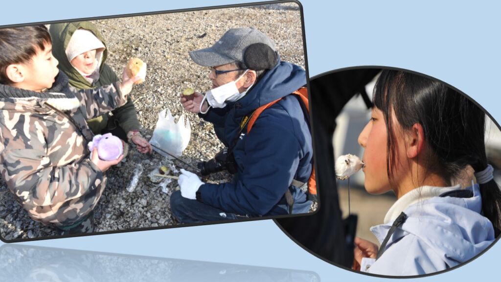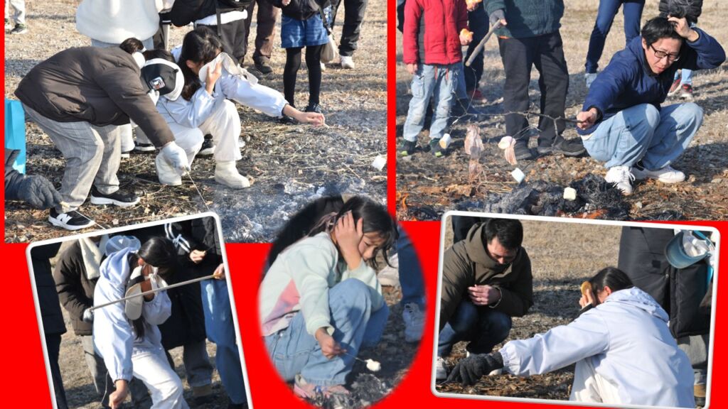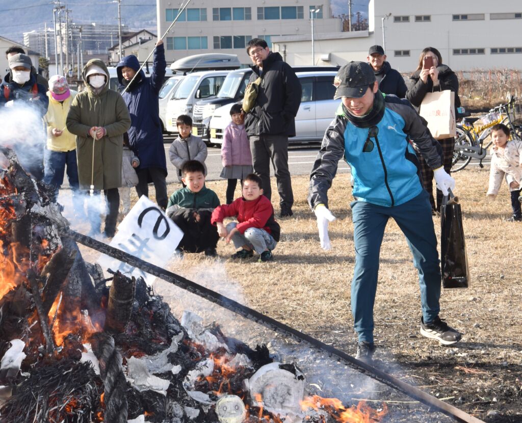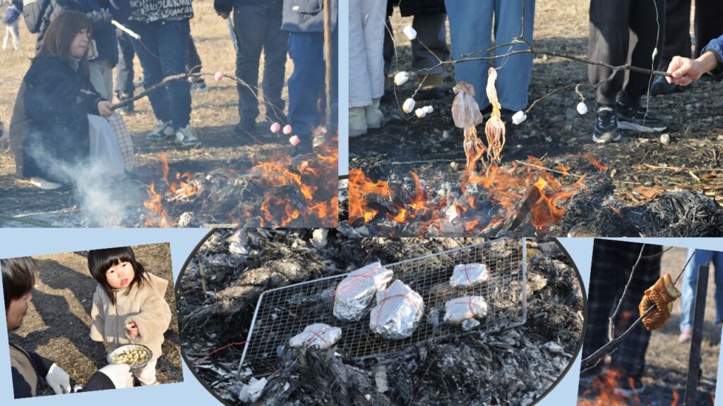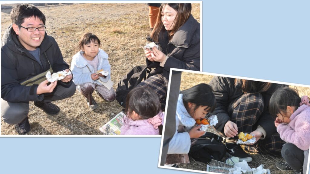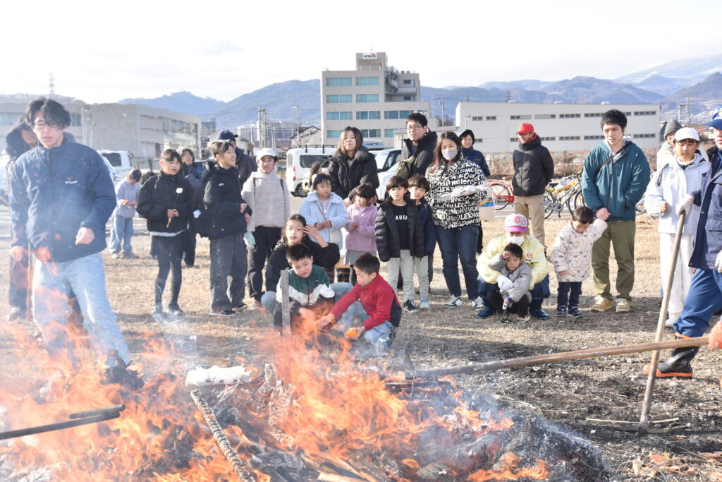 火の熱さが届かない回りでは早速、焼きあがったお餅やサツマイモを口する家族も。今年1年の無病息災、家内安全の願いを込めていました。