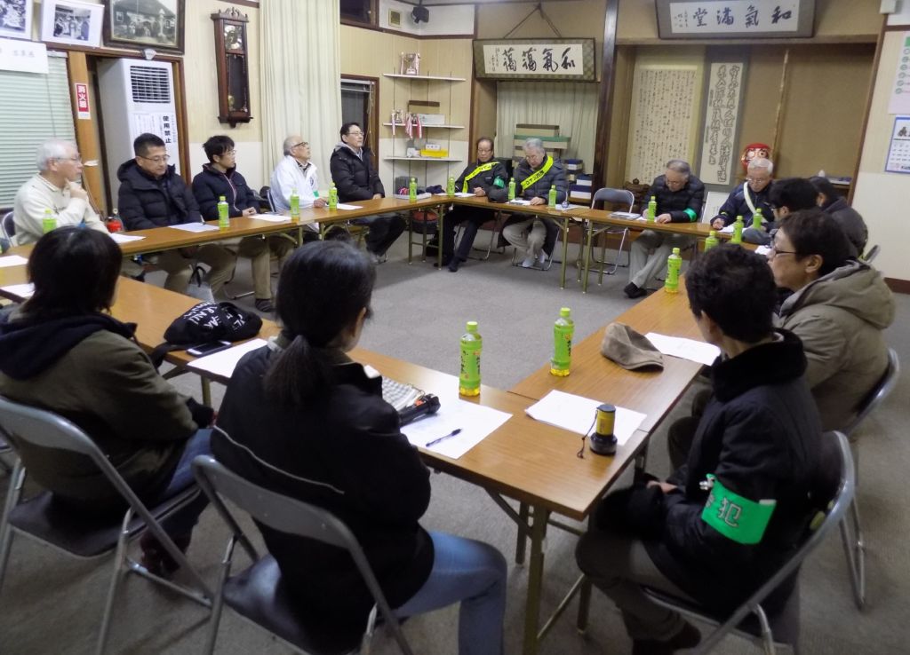 終了後、全員が公民館に集まって班ごとにパトロールの結果を報告しました。内容は、路上駐車が1件あったことや、木が伸びすぎて防犯灯をさえぎって暗い、今年夏に見つかった放置バイクがまだある―などでした。幸い重大な問題はなく、安全に年末年始を迎えたいとの願いを込めながら年末防犯パトロールを終えました。