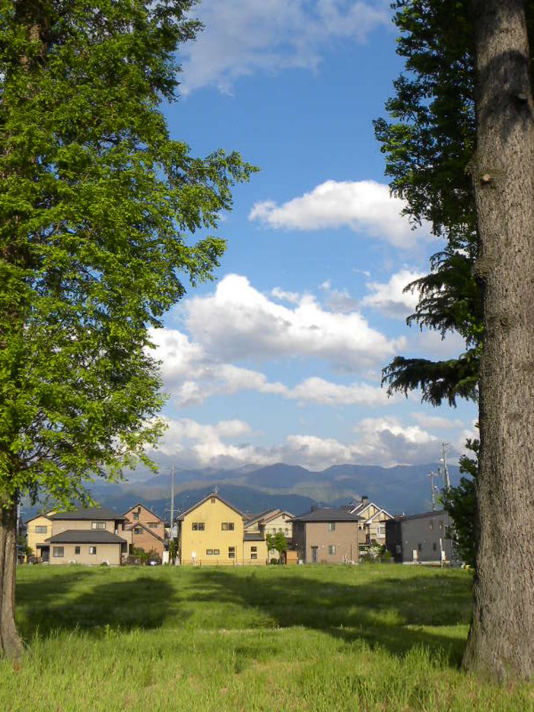 (大きな木を左右に配置し、その向こうにグリーンの草地、家並があり、さらに段々と重なる雲が浮かぶ大空。見る人の視線を手前から奥へと誘導すること奥行きが出ました。手前左の木の幹が右の幹に比べ少し物足りないので、もう少し幹を入れるとバランスよくなります。)