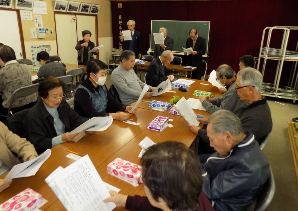 開会に先立ち、会員の故人に対して参加者全員が黙とうをしてご冥福を祈りました。続いて全員で「老人クラブの歌」を斉唱、「同じ仲間だ、輪をつくれ」「みんな元気で、さあ、生きぬこう」などの歌詞を高らかに歌い上げました。