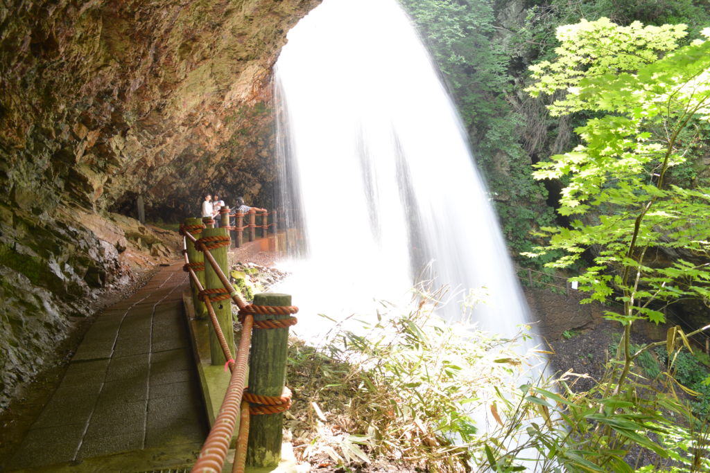 滝を内側から見ることができ別名「裏見の滝」と呼ばれる滝。その裏側の部分に露出を合わせ、岩盤や歩道の様子がよく分かります。その分、明るい滝の水は調子が飛び、白糸のようになりかえって面白い感じの作品になりました。右の樹木、滝、裏側と縦三分割構図でまとまっています。水の部分に露出を合わせると、暗い部分は真っ暗につぶれ、また、違った感じのものになります。