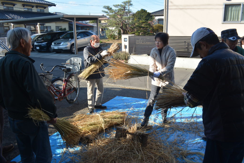 12月14日(土)に公民館主催の文化教養講座として「しめ縄及び門松づくり」講習会が石渡公民館で開かれました。朝9時から「しめ縄づくり」が館内で、「門松づくり」が玄関前を会場として始まり、「しめ縄づくり」では講師の飯島源一さんから藁の文化が生活の中にあり、稲藁は畳の芯やわらじ、藁靴、蓑、荒縄などに加工されてきた。中でも藁を用いた風習は、今でも注連縄(しめなわ)や新年の注連飾りなど、日本の行事に大きな役割を果たした。次にボウジメ(大根注連)、ワジメ(輪飾り)の作り方、作る過程の注意点の説明を受けた後、参加者はそれぞれ外で昔の道具を使って、ボウジメ用の藁づくり、手順にそって作業を開始、分からない所は講師に聞いたり、お互いに教え合えながら、2時間程でボウジメ2本を作ることができました。
