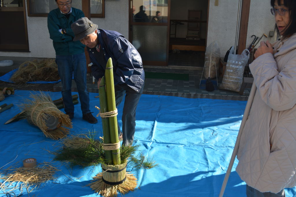又、「門松づくり」は初めての開催ということで、朝、早くから竹、一斗缶、菰及び荒縄などを用意していただきました。竹の切り方、飾り付けは自己流でチャレンジ。特に竹は切り方により、色々表情が変わり、斜めの切り方に苦心しておりました。