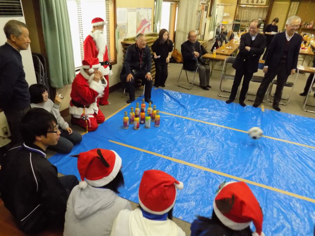 ゴムボールをころがして、手作りのピンを倒すボウリングゲーム。「ガンバレ」との声援が送られました