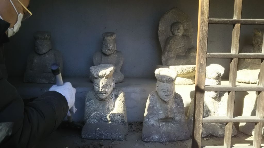 ■ 石渡区, 区長からのお知らせ, 石渡フォトニュース 十王像の清掃を実施しました 2020年2月3日 記者 石渡公民館の東側に「十王像」が納められている一郭があります。昭和54年に現在の公民館が建て替えられたときに移設された模様です。長年に亘り砂埃にまみれていたことから、この度区の3役が清掃しました。 解説の看板にもあるように、どことなく隣の大陸育ちの顔立ちを拝顔できました。遙か遠い歴史を感じました。 【文と写真:石渡区長 廣澤一由】 清掃する副区長の横田一雄さん(左)と区会計の宮澤一成さん 清掃中 清掃後 全ての清掃を完了 綺麗になりました もとの状態に戻して 十王像の解説