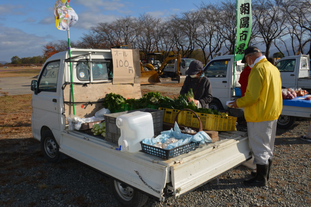 当日は、天候に恵まれ、朝早くからテントを張り、野菜を積んだ軽トラック6台程が集まりました。テントでは、バルセイログッツ、綿あめ、ポップコーン、菊芋焼酎「朝陽」などを、軽トラックでは、りんご、きゅうり、里芋、ネギ、柿、さつまいも、ほうれん草、南瓜、白菜などの野菜が販売されました。