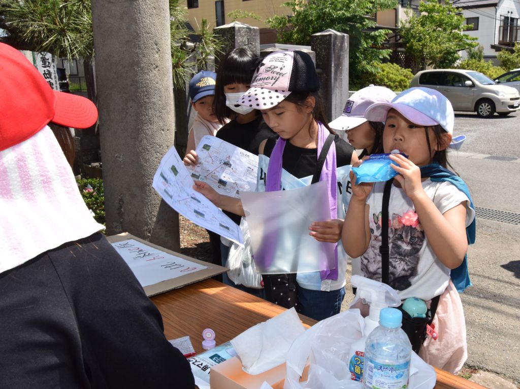 チェックポイントは神社鳥居前。クイズが当たると、担当者ともどもに「正解!」と拍手