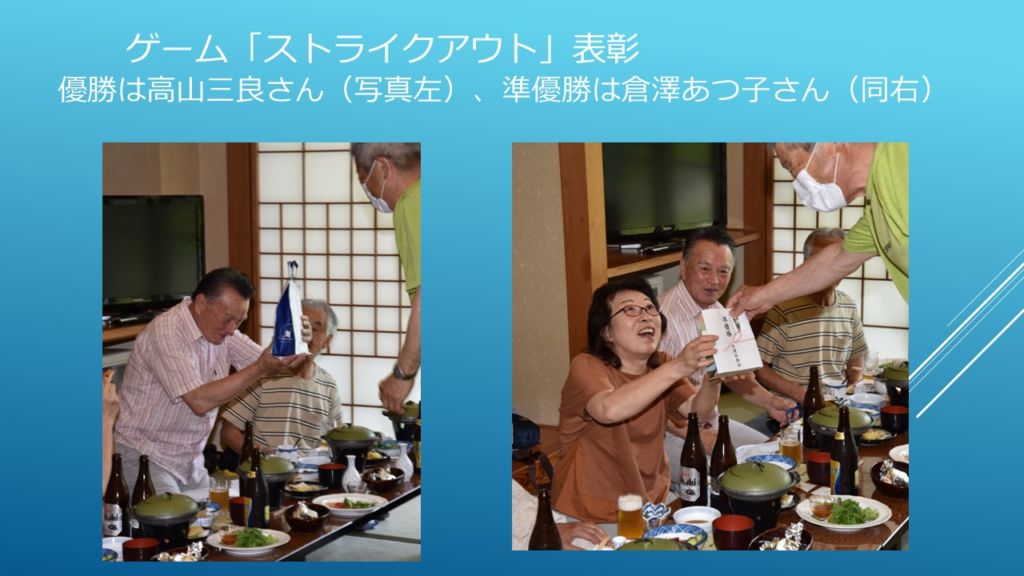 ソーシャルディスタンを保ちつつ、近況報告や健康、長寿会の活動などの話で大いに盛り上がりました。マレットゴルフ、ストライクアウトの成績発表と表彰、ビンゴ大会。廣澤会長と高山健治さんによるカラオケも飛び入り、自粛ムード?か一曲だけで終了。