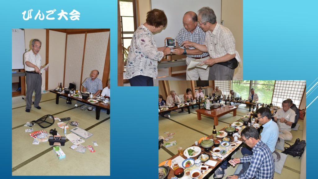 1時間強のお楽しみ後は、飯縄山、霊仙寺山山塊が目の前に迫る温泉でひと汗流し、昼食の懇親会。連日の猛暑とお楽しみのゲームで乾ききった喉を冷たいビールで「乾杯」。久々に耳にする掛け声は、しばらく懇親の席が途絶えていただけに皆さん生気を一気に取り戻したようでした。