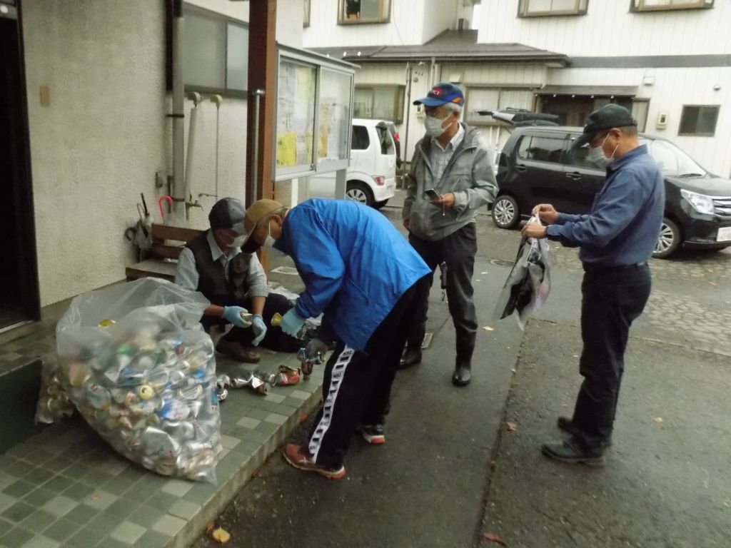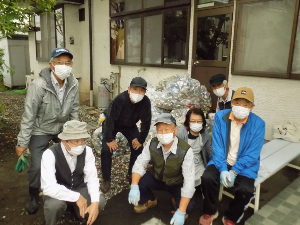 石渡長寿会が9月28日、石渡公民館で今年2回目のアルミ缶回収を行いました。資源のリサイクル推進と、会の活動資金を得るための事業です。